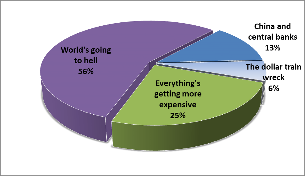 Well there you have it - “the world’s going to hell” (wars, sanctions, chaos) came out top with a resounding 56% of your votes, followed by “everything’s getting more expensive” at 25%, China and central banks at 13% and only 6% of you gave credit to the dollar!