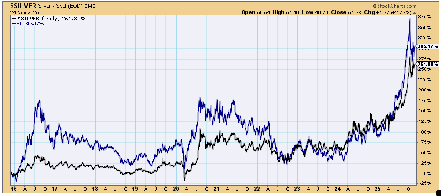 The 10 year chart shows SIL has outperformed silver, and as you’d expect, it’s performance is much more volatile than the metal itself.