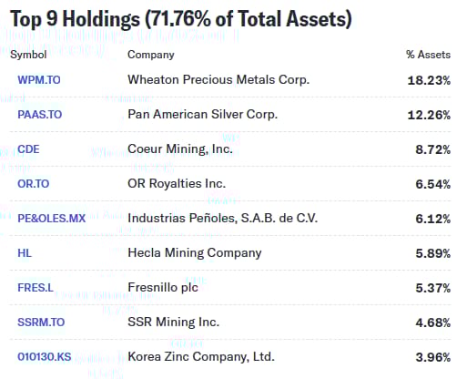 SIL is the Global X Silver Miners ETF - a fund that owns 40 of the big silver companies for you, with Wheaton, Pan American and Coeur making up around 40% of the fund. It's a turbo-charged bet on the companies digging up the white metal that's powering everything from your iPhone to Tesla's battery pack and its current market cap is $3.7 billion.
