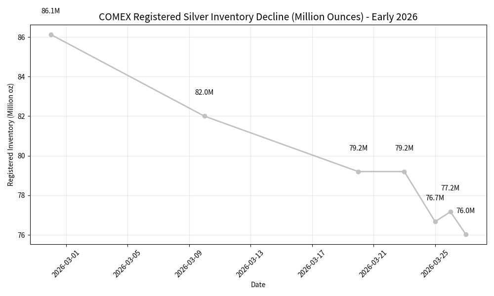 COMEX registered silver just hit 76.02 million ounces as of March 26-27. That's down 1.14 million ounces in a single day and 10.3 million ounces (11.9%) in the past 30 days. The coverage ratio sits at 13.4%. That's stress territory.